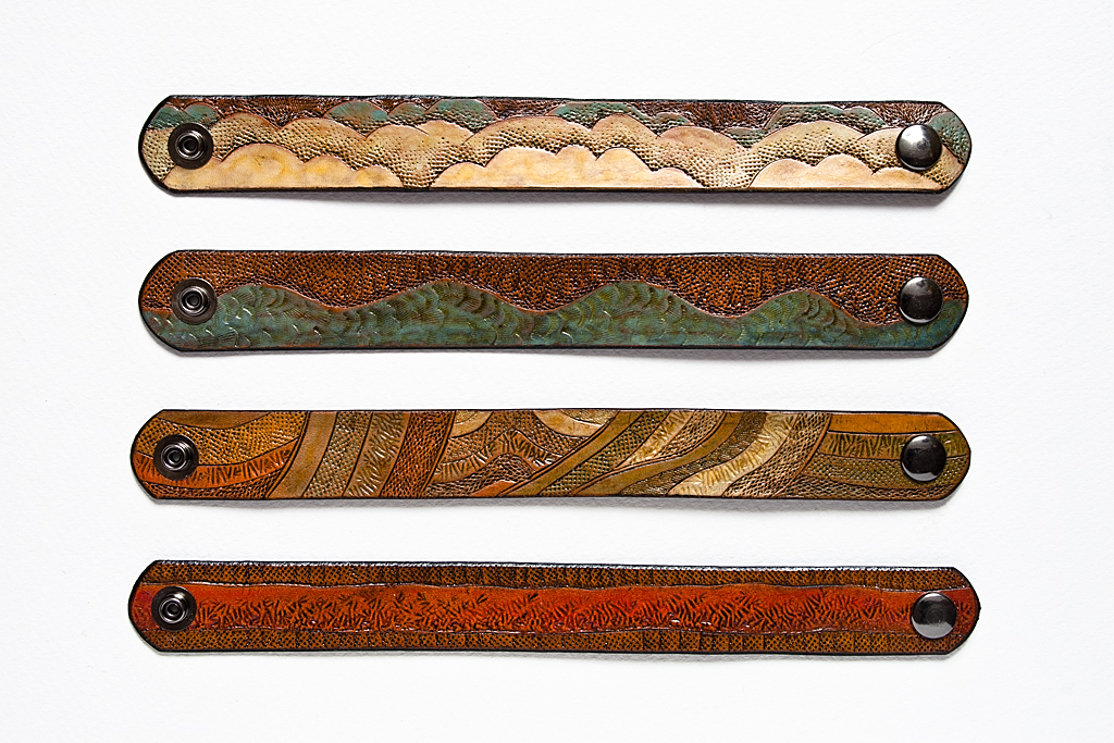 This evening, I finished making a series of leather bracelets I’m calling “Earth, Air, Water, and Fire”. The bracelets, 1″ x 9″ x 3/32″, are hand-tooled with graphic designs, each representing a different natural element. They are hand-painted and finished with a light antique gel. They close with a snap.