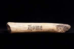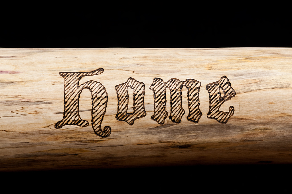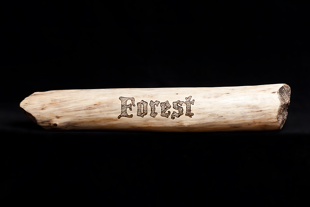 Then last evening, after a long day out at the cabin clearing the snow from the road, and collecting wood, my muscles weary, and my mind tired, I walked past the log sitting on the floor. As I looked at it I plainly saw the words forest and home in large, dark, block letters on the surface of the log. I had my idea. I tried out a few different typestyles on my computer and settled on Blackmoor, a blackletter font, for its blocky yet calligraphic shapes. I would use a wood-burner to brand the words into the log.