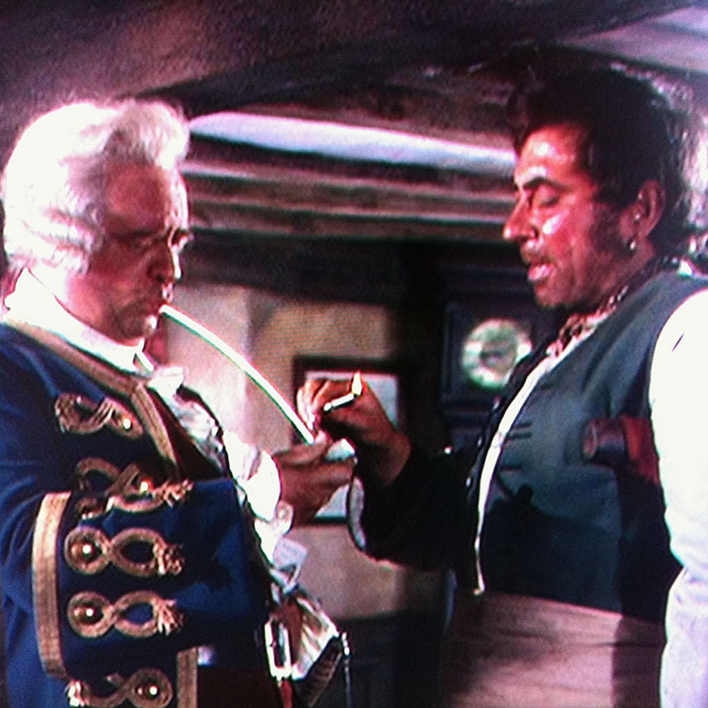 Piratical Pipes 4: Long John Silver lighting Squire Trelawney’s pipe Long John Silver lighting Squire Trelawney’s pipe.