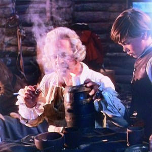 Squire Trelawney lighting his personal clay pipe using a candle while Jim Hawkins looks on. This scene takes place while the crew are hiding out in the stockade on the island. Note that this pipe is substantially shorter than the pipes offered up in the tavern and offers much more practicality for the sea-traveller.