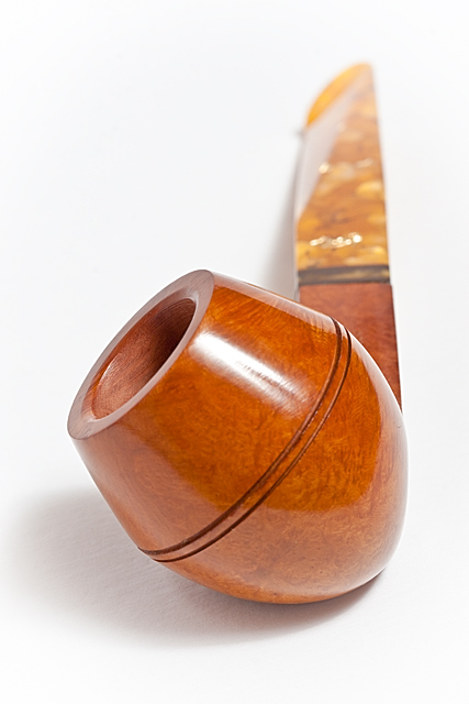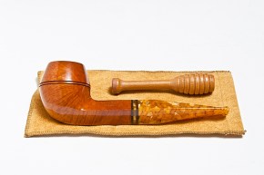 I received this pipe, a Savinelli Miele Bulldog, from danishpipeshop.com several weeks ago. I’d seen this series on that site months ago when I first took up the pipe, and fell in love. I always had it in my mind that I would order one someday. Well, here it is. The Miele series is the third in Savinalli’s food inspired pipe series, after Chocolate and Coffee. Miele is Italian for honey, and the pipes in this series come complete with a wooden tamper in the shape of a honey dipper. The bowl is finished in a warm light stain, and the golden acrylic stem reminds one of honeycombs. The pipe comes in suede-textured golden pouch, and everything is packaged in an amazingly designed box.