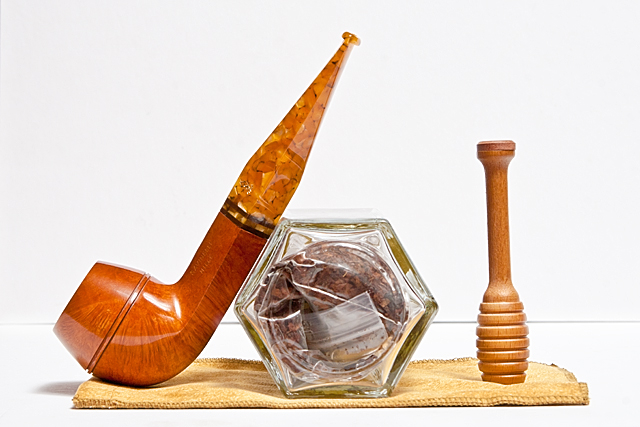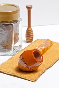 In the mornings I drink tea with honey. The brand of honey I have been using recently comes in a hexagonal jar. I finished a jar yesterday and set it aside for use as a tobacco jar. Besides conscientiously pairing tobaccos with my pipes, I also like to accessorize my pipes with aesthetically or conceptually similar tampers, pouches, etc. It makes sense to me to pair the Savinelli Miele Bulldog and Majdy blend with the hexagonal honey jar.