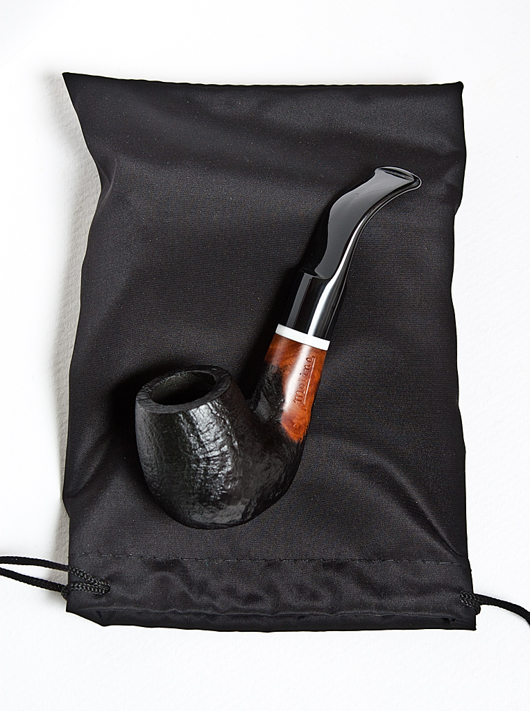 I waited until I got home to open the package. Inside, was a black satin pouch containing a lovely full bent billiard with a rusticated bowl and white band. The shank was stamped Molina, Made In Italy. My friend (or more accurately, her husband) had picked up the pipe in a shop in Italy, but had waited until arriving in Germany to ship it. (A wise, choice, as I have no doubt the German post office is more efficient than the Italian).