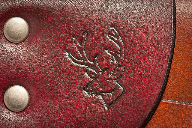 I tried to match the coloration of the sheath with the knife handle. I first dyed the sheath brown, applied a bit of yellow dye, and then applied USMC black dye. The black dye I applied sparingly only to the tip of the sheath, and then with a cloth, blended it into the brown. I repeated this a few times until I had a nice smooth blend from solid black at the tip to warm brown at the top.